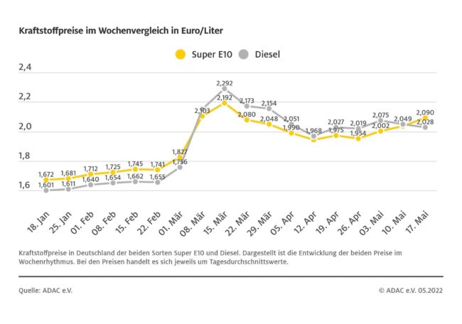 Benzinpreis steigt um 5,4 Cent – ADAC: Schon heute zu hohes Preisniveau schaukelt sich weiter nach oben – Dieselpreis sinkt um mehr als zwei Cent