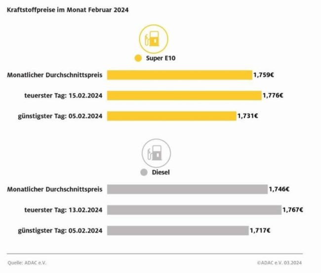 München (ots) Die Autofahrerinnen und Autofahrer mussten im Februar 2024 spürbar mehr beim Tanken bezahlen als im Januar. Ein Liter Benzin war um 2,7 Cent teurer, ein Liter Diesel sogar um vier Cent. Das zeigt die monatliche ADAC Auswertung der Kraftstoffpreise in Deutschland. Danach kostete ein Liter Super E10 im Februar im Durchschnitt 1,759 Euro. Für…