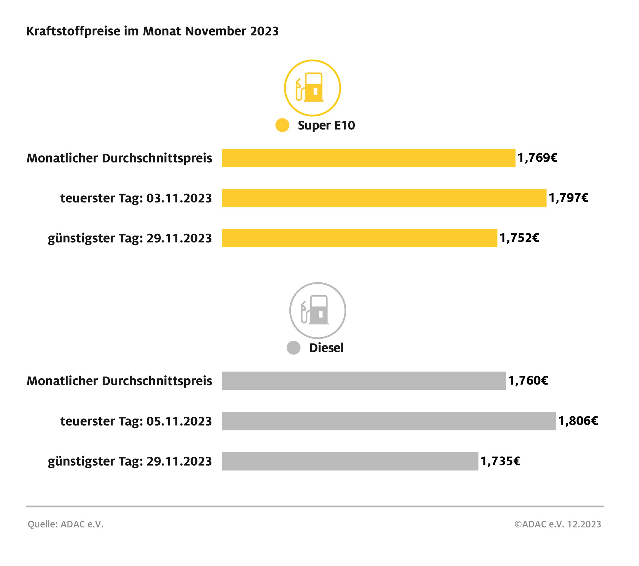 Teuerster Tag zum Tanken war für Fahrer von Benzinern der 3. November. Ein Liter Super E10 kostete damals 1,797 Euro. Am günstigsten war Super E10 dann am 29. November mit 1,752 Euro. Der Dieselpreis hat sich im Laufe des Novembers sogar etwas stärker verbilligt als Benzin: Am teuersten war der Selbstzünderkraftstoff am 5. November mit 1,806 Euro und erreichte ebenfalls am 29. November mit 1,735 seinen Monatstiefststand.