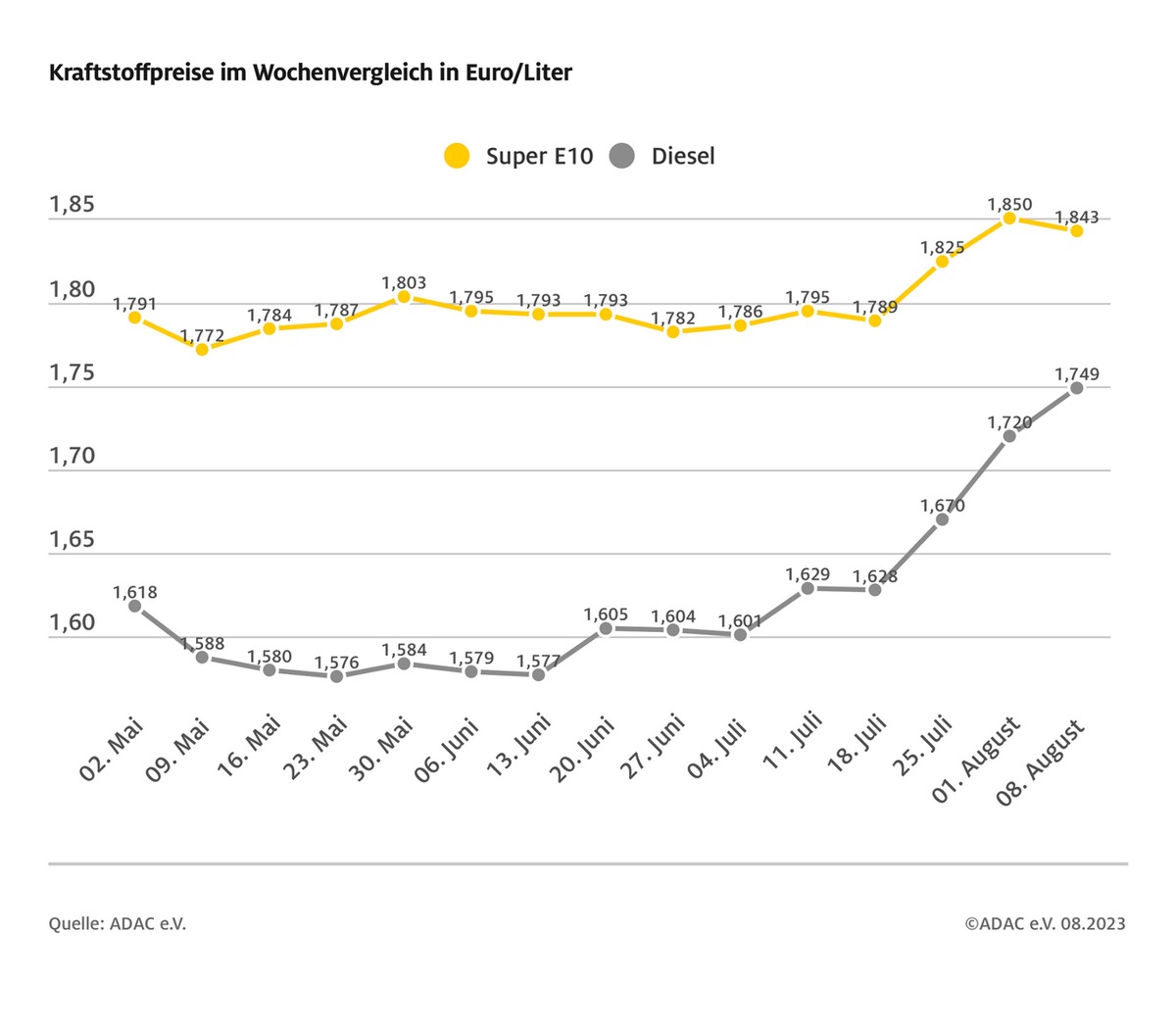 Dieselfahrer müssen derzeit regelmäßig spürbar höhere Preise verkraften. Innerhalb von nur vier Wochen ist der Diesel-Preis um zwölf Cent gestiegen. Wie die aktuelle ADAC Auswertung der Kraftstoffpreise in Deutschland zeigt, kostet ein Liter Diesel im bundesweiten Mittel zurzeit 1,749 Euro. Gegenüber der Vorwoche bedeutet dies einen Anstieg von 2,9 Cent.
