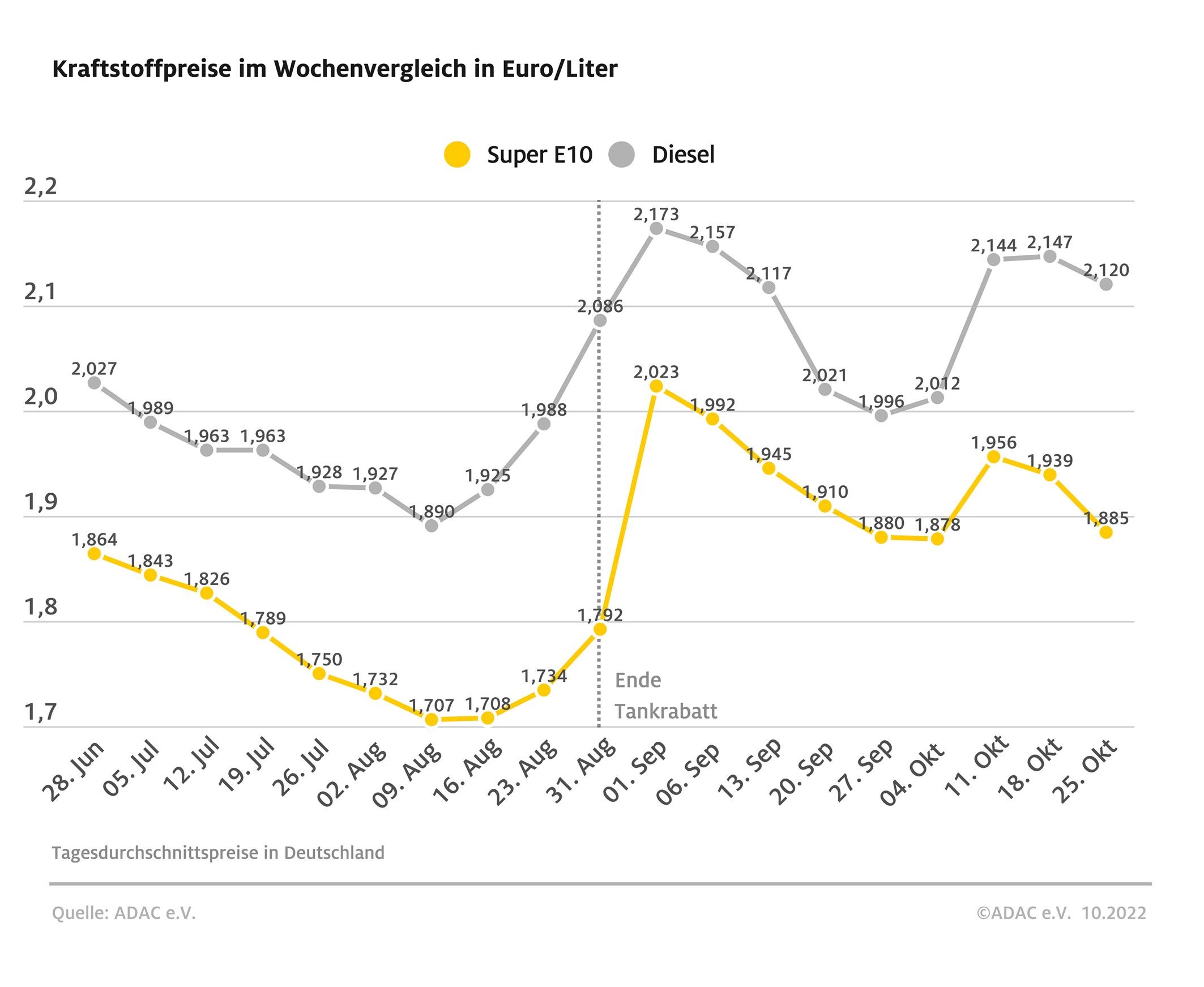 Trotz des leichten Rückgangs sind die Preise an den Tankstellen immer noch deutlich zu hoch, vor allem bei Diesel. Hier spielen zwar auch Sonderfaktoren eine Rolle, wie die jahreszeitlich bedingte stärkere Heizölnachfrage oder der hohe Dieselbedarf der Industrie als Gasersatz. Auf einen Liter Diesel entfallen allerdings über 20 Cent weniger Energie- und Mehrwertsteuer, der Liter kostet aktuell aber über 23 Cent mehr als Super E10.