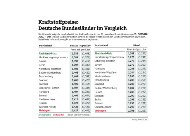 München (ots) In dieser Woche können Autofahrer entspannt an die Zapfsäulen fahren, denn laut aktueller Auswertung des ADAC sind die Preise für Diesel und Super rückläufig. Vor allem bei Super E10 ist der Rückgang mit 1,2 Cent pro Liter deutlich. Ein Liter kostet im bundesweiten Durchschnitt nun 1,384 Euro. Beim Diesel fällt der Preisrückgang mit 0,1…