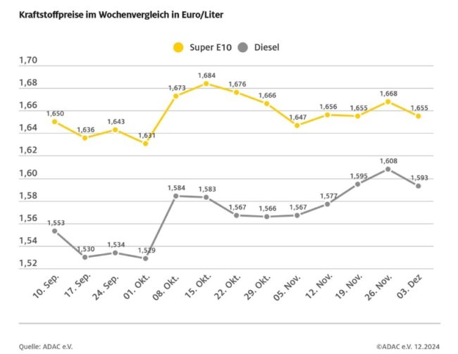 ADAC: Spritpreise geben etwas nach – Benzin im Vergleich zur Vorwoche um 1,3 Cent billiger, Diesel um 1,5 Cent