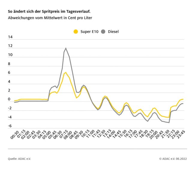 ADAC: Deutlich größeres Sparpotenzial beim Tanken – Tagesverlauf-Auswertung: Dieselfahrer tanken abends rund 16 Cent billiger als morgens – Differenz bei Benzin bei zehn Cent