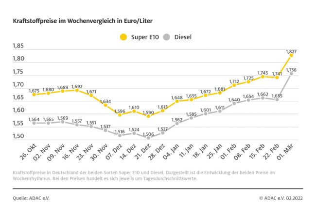 München (ots) – Der Anstieg der Kraftstoffpreise hat sich in der vergangenen Woche fortgesetzt: Im Vergleich zur Vorwoche kletterte der Preis für einen Liter Diesel um 14,2 Cent und liegt aktuell bei durchschnittlich 2,292 Euro. Das zeigt die aktuelle ADAC Auswertung der Kraftstoffpreise in Deutschland. Danach verteuerte sich auch Benzin erneut deutlich. Für einen…