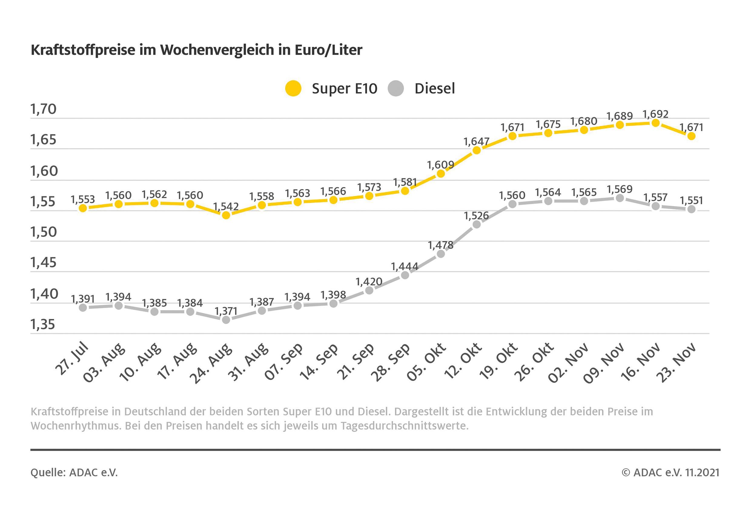 Trotz des aktuellen Preisrückgangs an den Zapfsäulen sieht der ADAC nach wie vor Spielraum für einen weiteren Preisrückgang. Hintergrund der Preisentwicklung ist die leichte Entspannung am Ölmarkt, allerdings gedämpft durch die Schwäche des Euro gegenüber dem US-Dollar. Für weitere Unruhe auf dem Ölmarkt sorgt das geplante Anzapfen der strategischen Ölreserve durch die USA und weitere Länder.