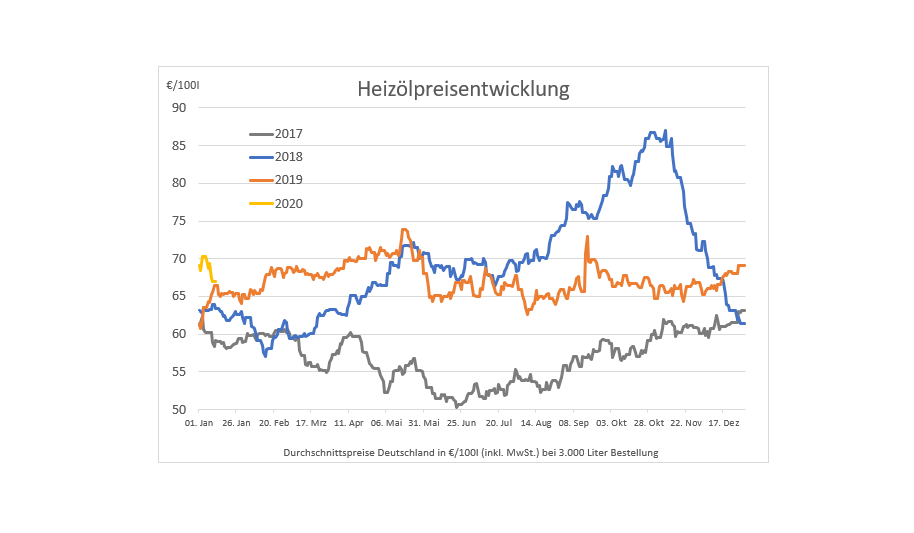 Das neue Jahr hat so hoch wie noch keins angefangen, wie noch keins der Jahre in der Statistik. Hielten sich die Jahre 2017-2019 noch ungefähr die Waage mit Preisen am 1. Januar von 61,20, 63,13 und 61,36 Euro, so startete 2020 mit schlappen 69,15 Euro pro 100 Liter Heizöl ins neue Jahr (Durchschnittspreise pro 100 Liter bei 3000 Liter Bestellmenge).