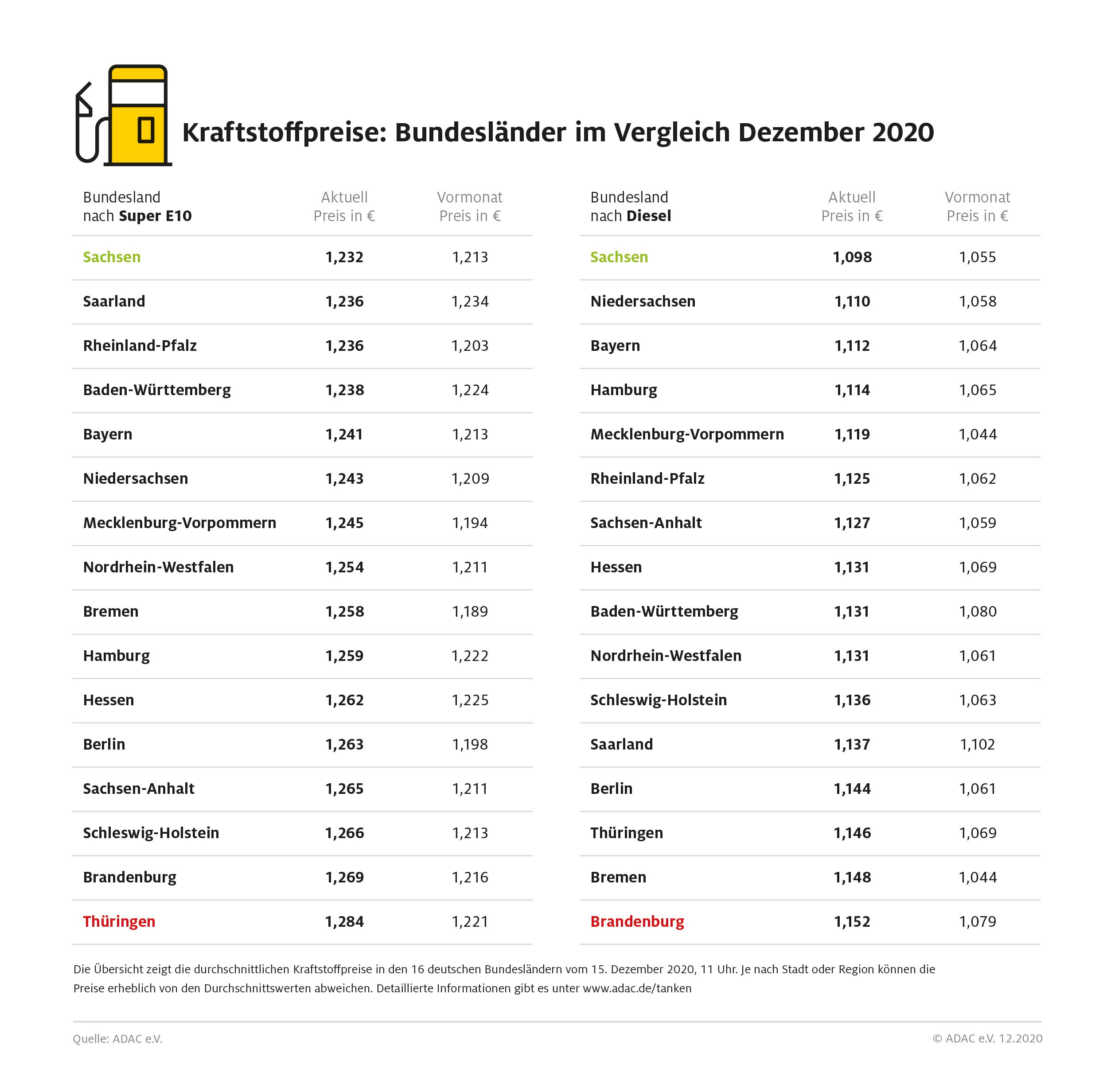 In Sachsen sind derzeit die Kraftstoffpreise so niedrig wie in keinem anderen deutschen Bundesland. Wie die aktuelle ADAC Auswertung der Benzin- und Dieselpreise in den 16 Ländern zeigt, kostet ein Liter Super E10 in Sachsen 1,232 Euro, der Preis für einen Liter Diesel liegt bei 1,098 Euro. Etwas teurer sind als jeweils Zweitplatzierte bei E10 das Saarland mit 1,236 Euro je Liter und bei Diesel Niedersachsen mit 1,110 Euro.